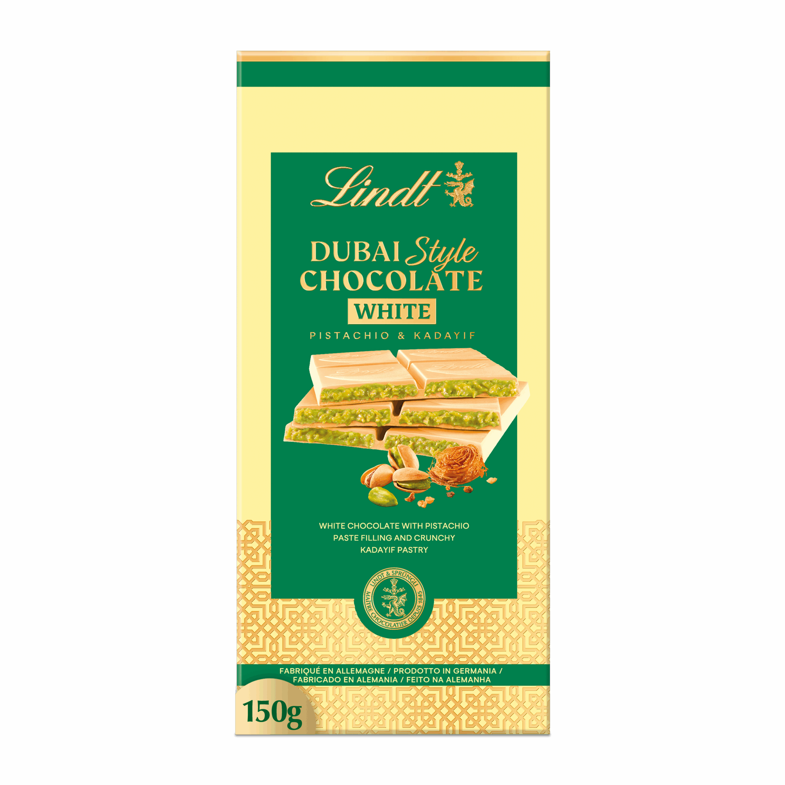 Un voyage gourmand entre Orient et délicatesse : chocolat blanc crémeux, cœur pistache fondant et kadaïf croustillant, en format de 150 g.
