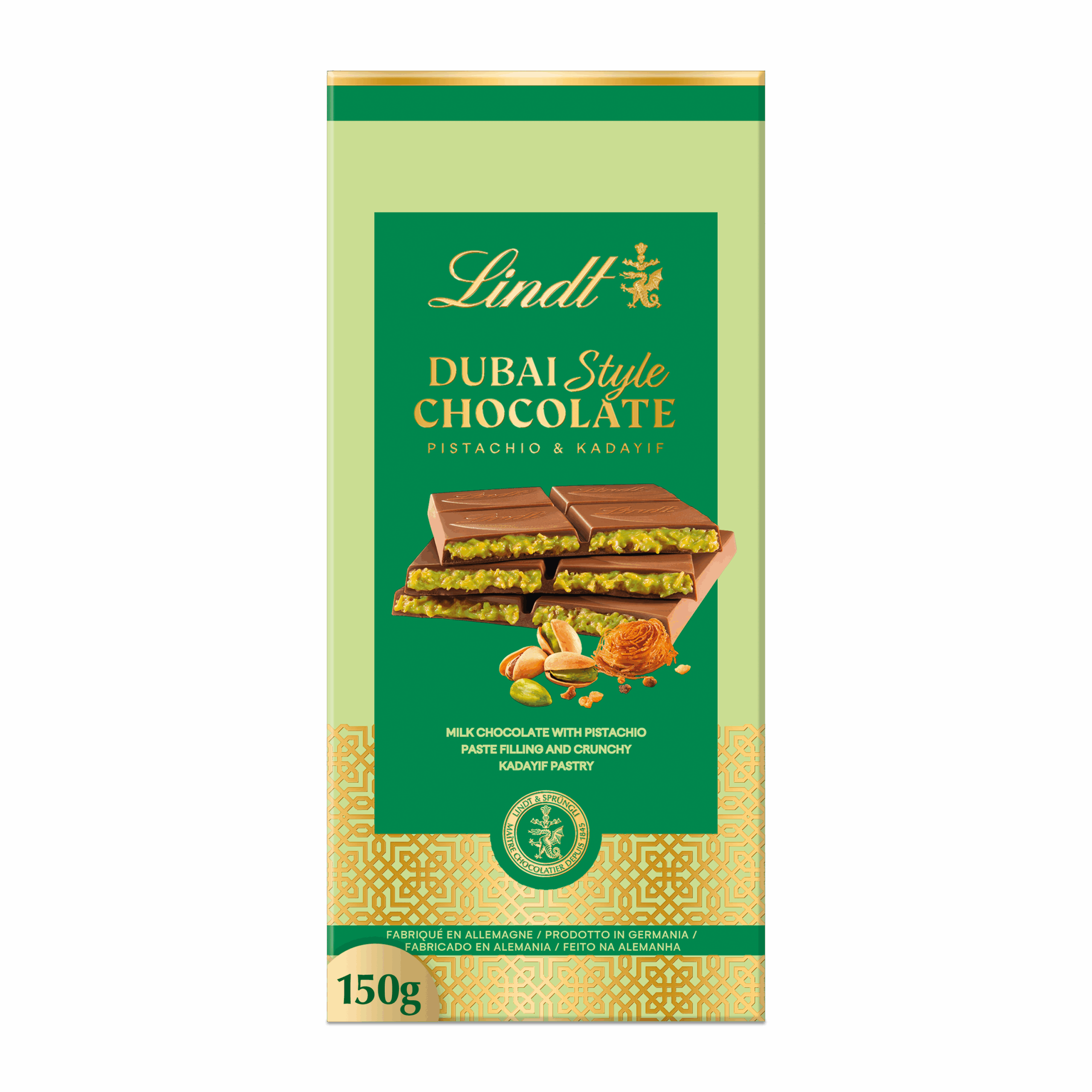 Chocolat au lait fondant, cœur pistache onctueux et éclats de kadaïf croustillants, pour une expérience unique et raffinée, en format de 150 g.