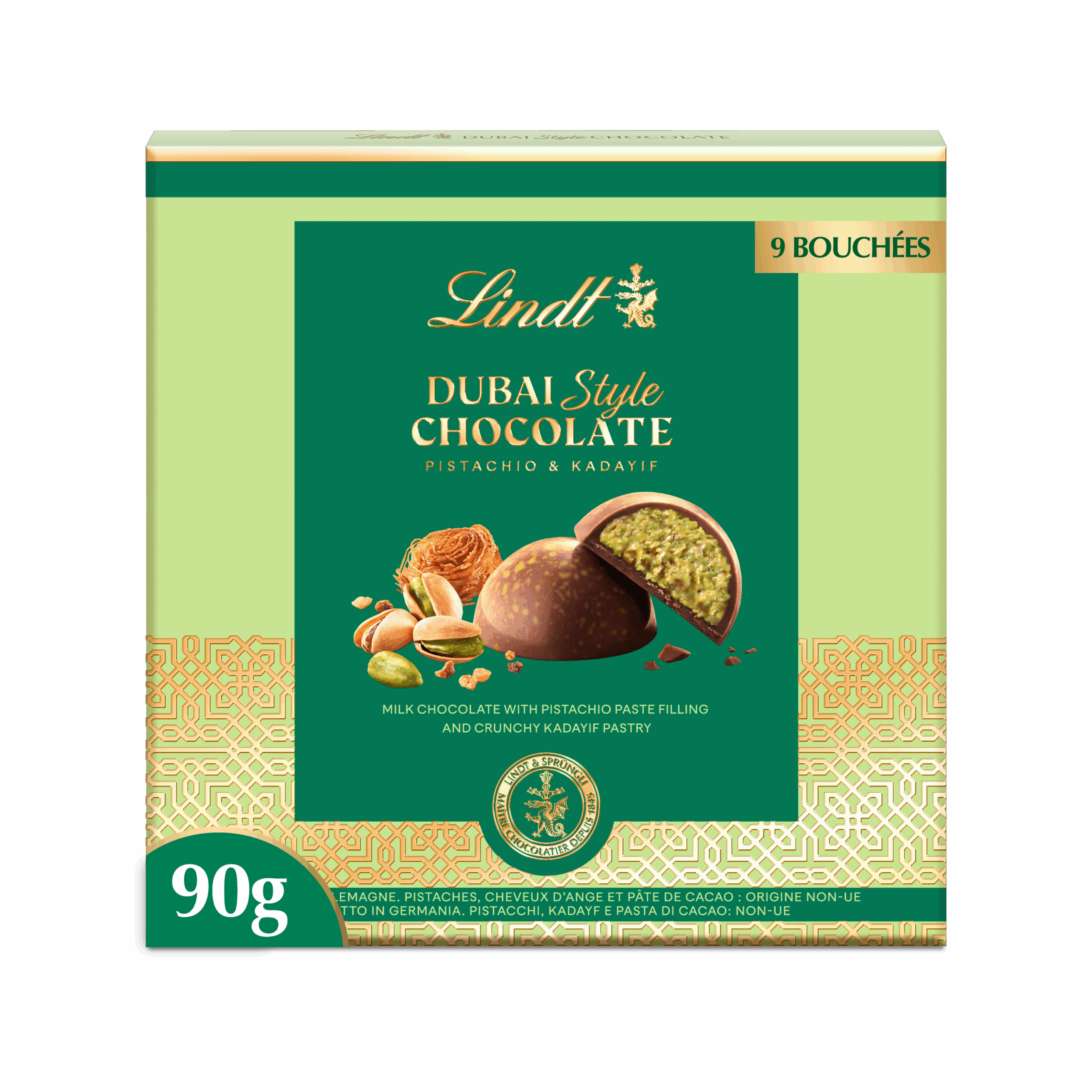 Bouchées de 90 g en chocolat au lait, cœur pistache et éclats de kadaïf, pour un moment gourmand et raffiné.