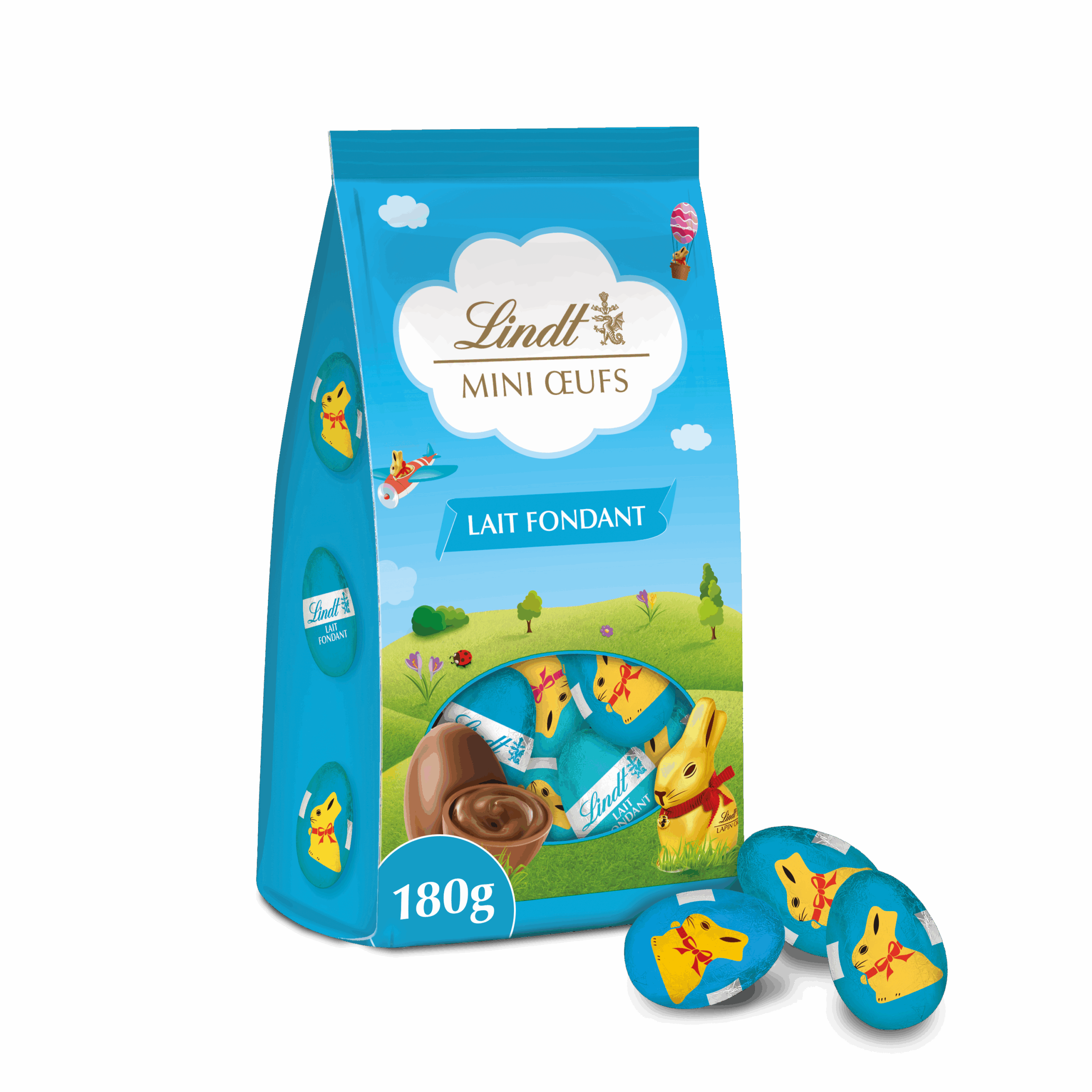 Sachet de mini œufs fourrés Lindt 180 g, disponibles en Lait Fondant, Praliné ou Assorti, pour une dégustation gourmande aux cœurs fondants.
