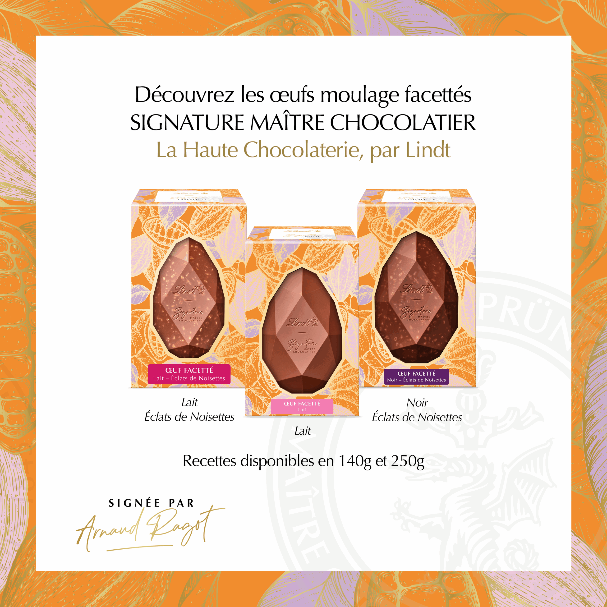 Œufs facettés Lindt 140 g, chocolat fin et cœur praliné, au lait, noisettes ou noir, pour un plaisir gourmand et raffiné.