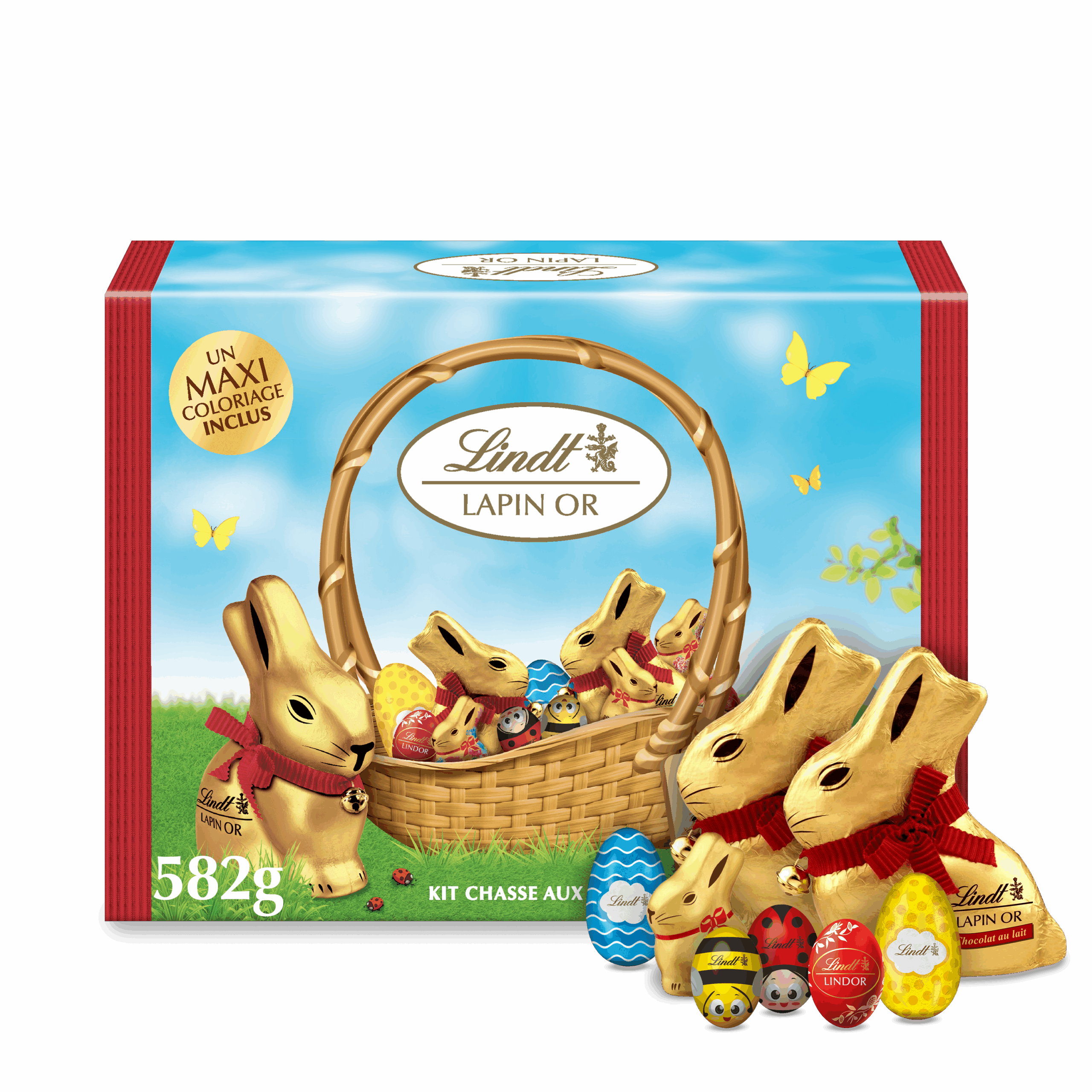 Kit Chasse aux Œufs Boîte Cadeau Lindt 582 g, avec 52 mini pièces en chocolat au lait et un maxi coloriage, pour des moments gourmands et ludiques à Pâques.