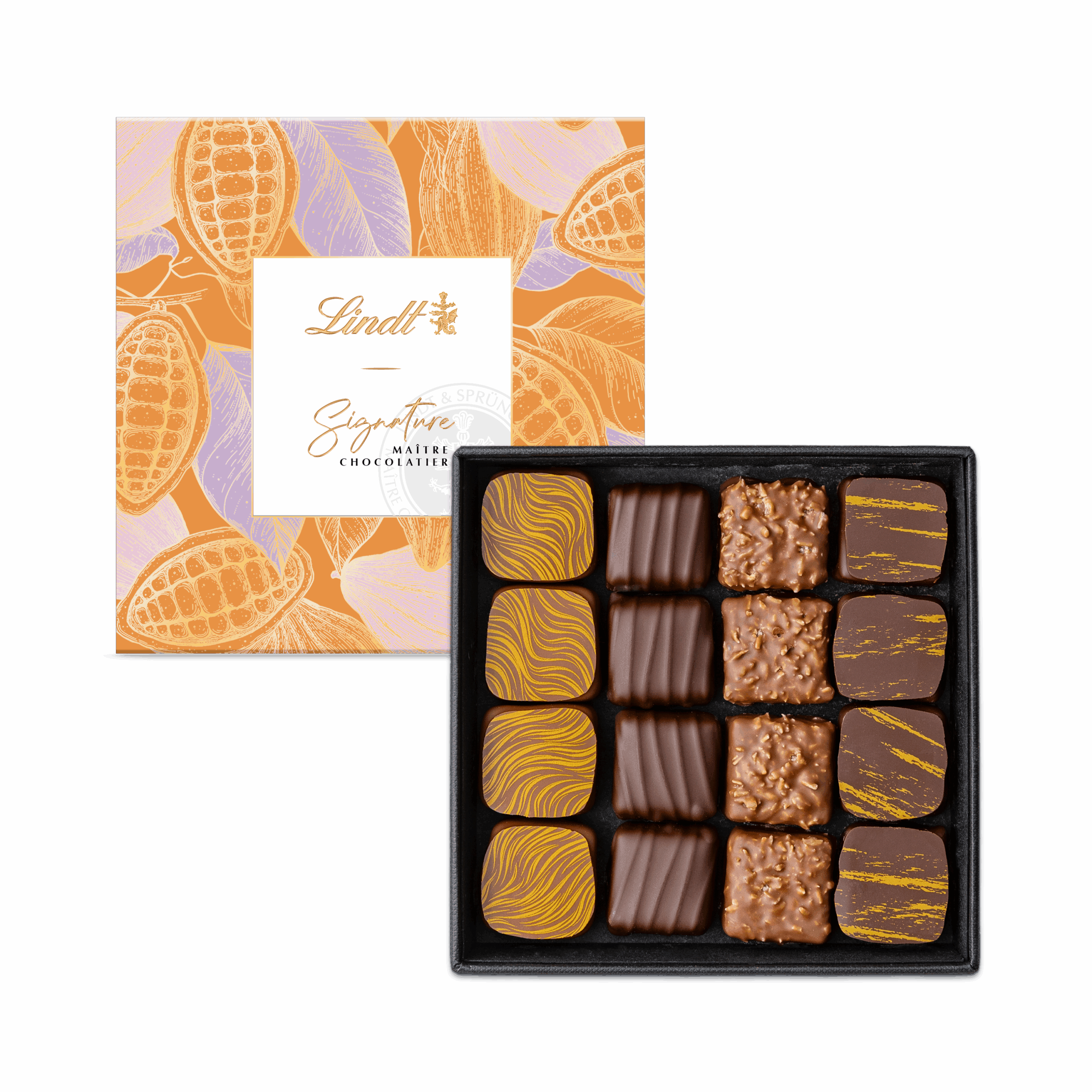 Coffret de 16 bouchées Lindt 154 g, chocolat noir et au lait avec pralinés aux éclats de cacao, noisettes, noix de coco et amandes, pour un plaisir gourmand et élégant.