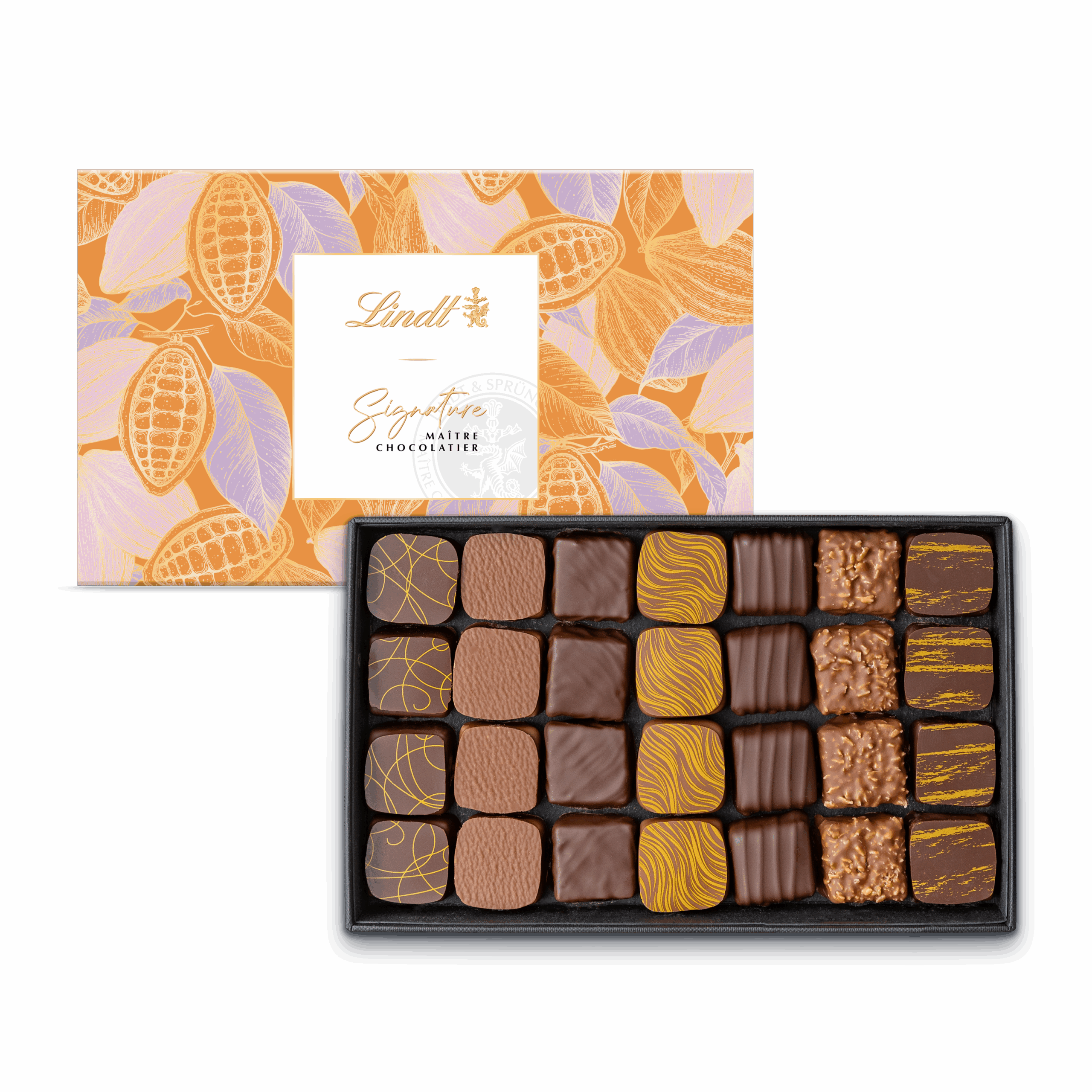 Coffret de 28 bouchées Lindt 269 g, chocolat au lait et noir avec pralinés aux noisettes, amandes, noix de coco, yuzu et thé, pour une dégustation gourmande et raffinée.