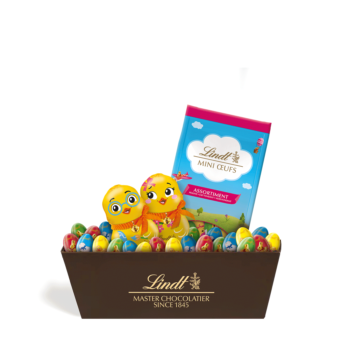 Coffret Poussin Lindt de 620 g associant poussins en chocolat et mini œufs assortis, pour une célébration de Pâques gourmande et conviviale.