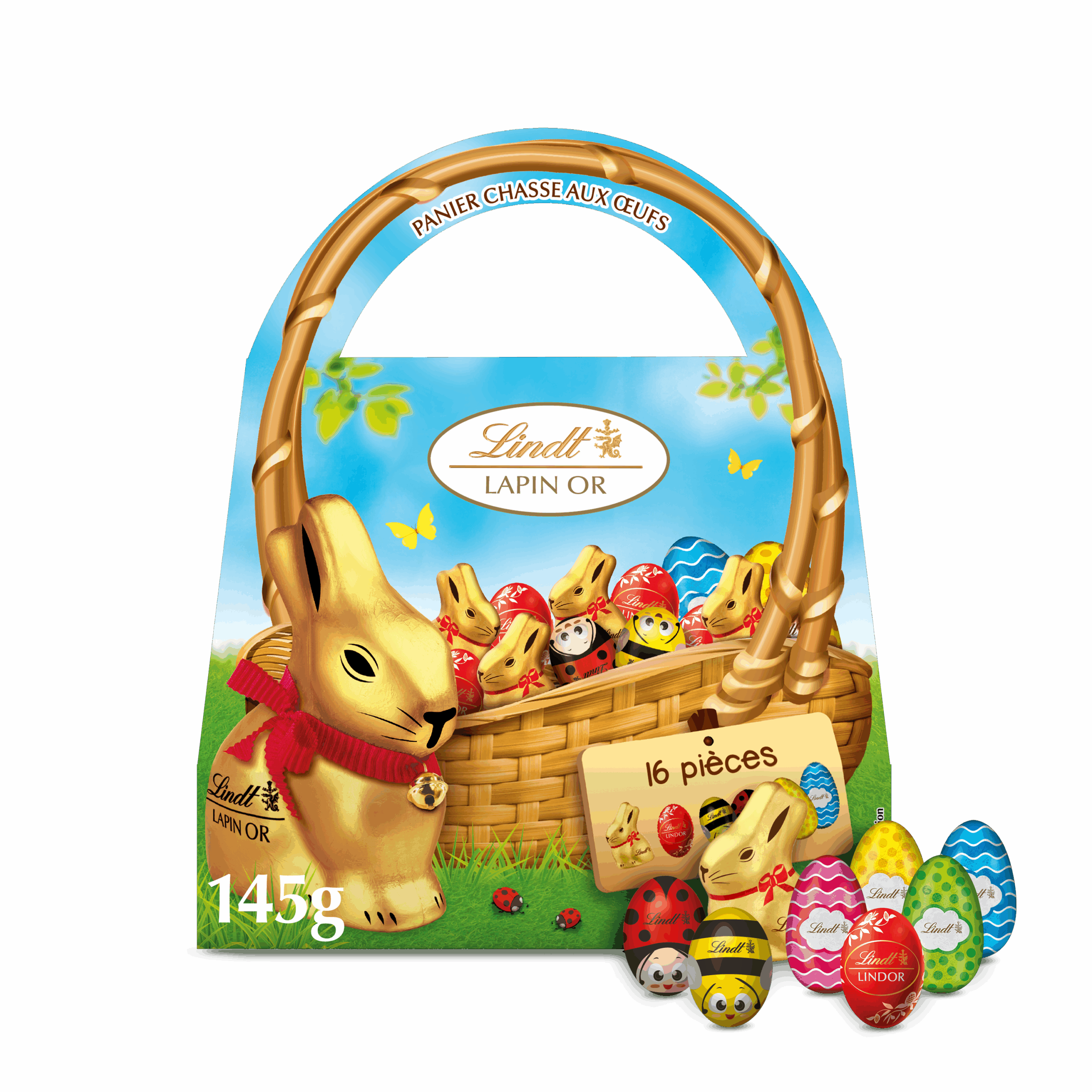 Panier Chasse aux Œufs Lindt de 145 g, avec 16 mini chocolats au lait, pour des moments gourmands à partager ou offrir à Pâques.