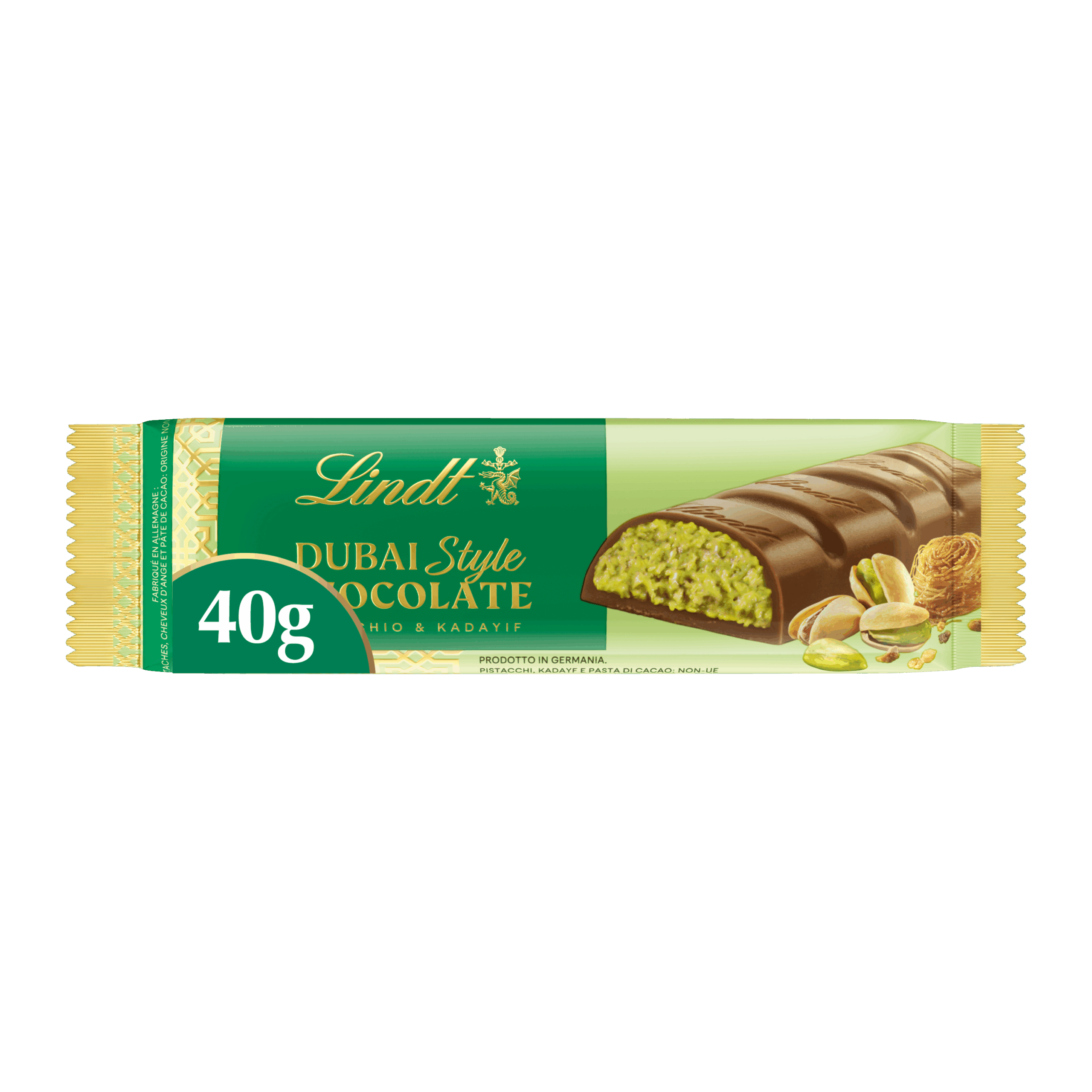Barre nomade de 40 g en chocolat au lait, cœur pistache et éclats de kadaïf, pour une pause gourmande raffinée.