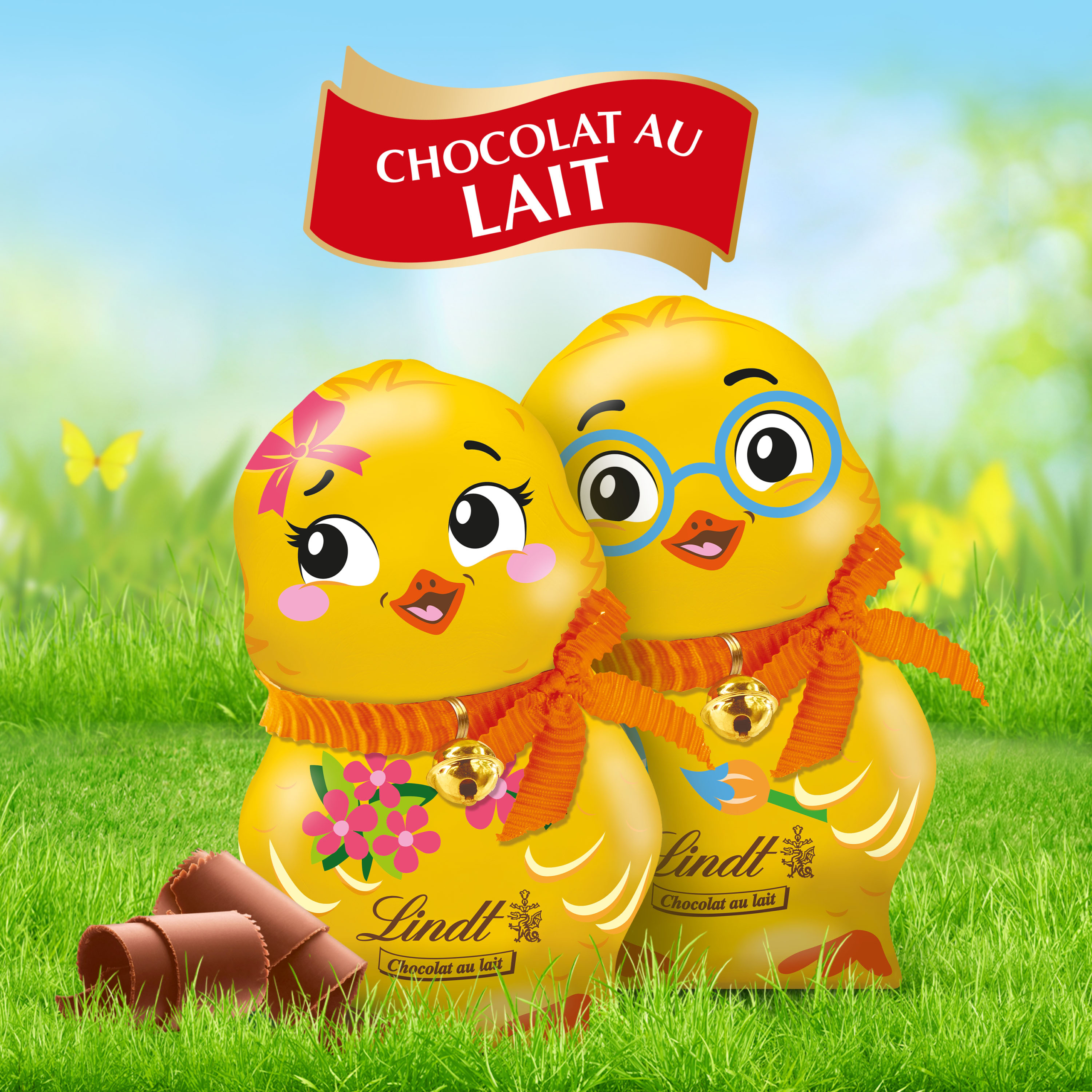 Poussin Lindt 100 g en chocolat au lait, décliné en différents personnages ludiques pour un plaisir gourmand et festif à Pâques.