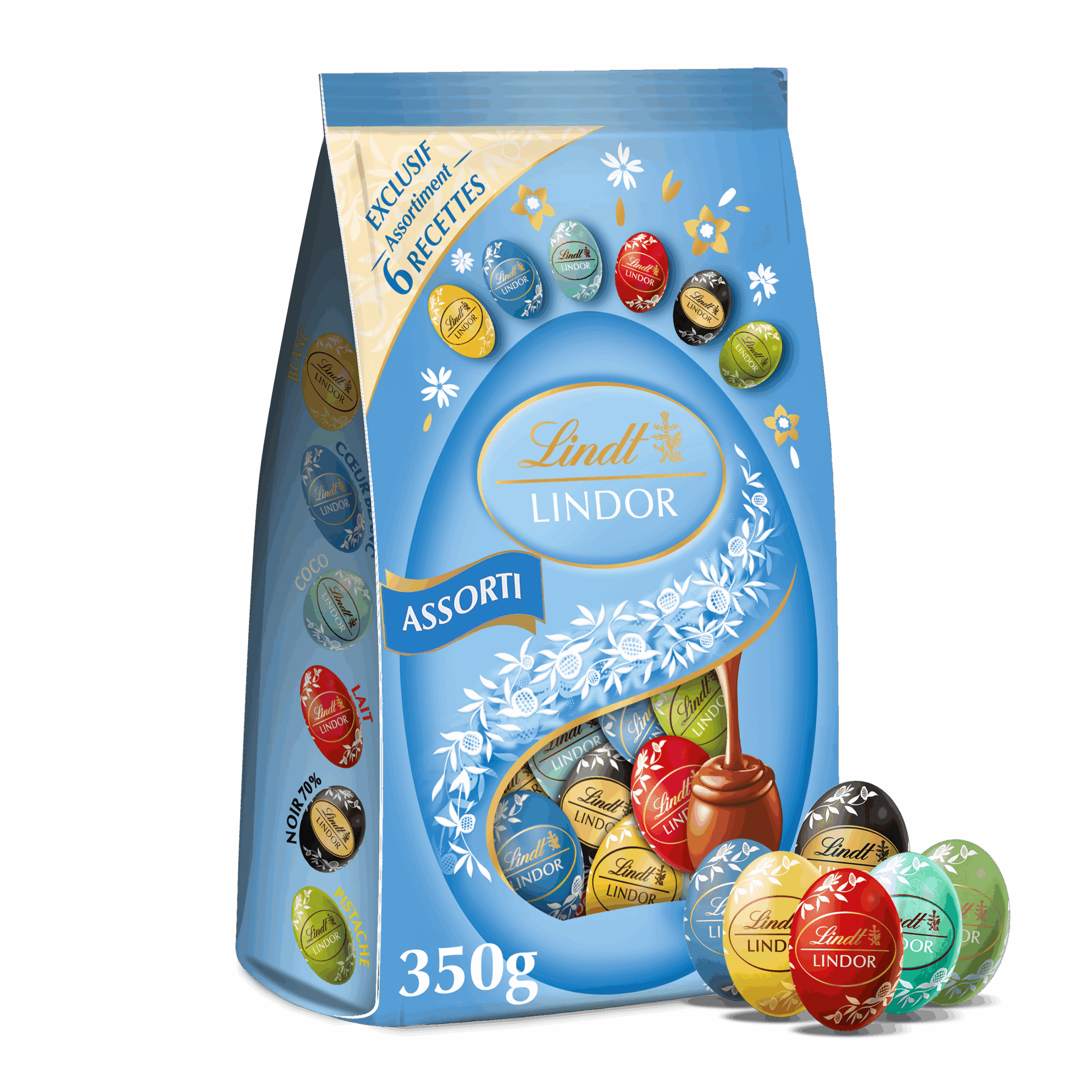 Sachet de 350 g d’œufs Lindt LINDOR assortis, au chocolat fondant, réunissant six recettes gourmandes pour un plaisir raffiné à partager ou à offrir.