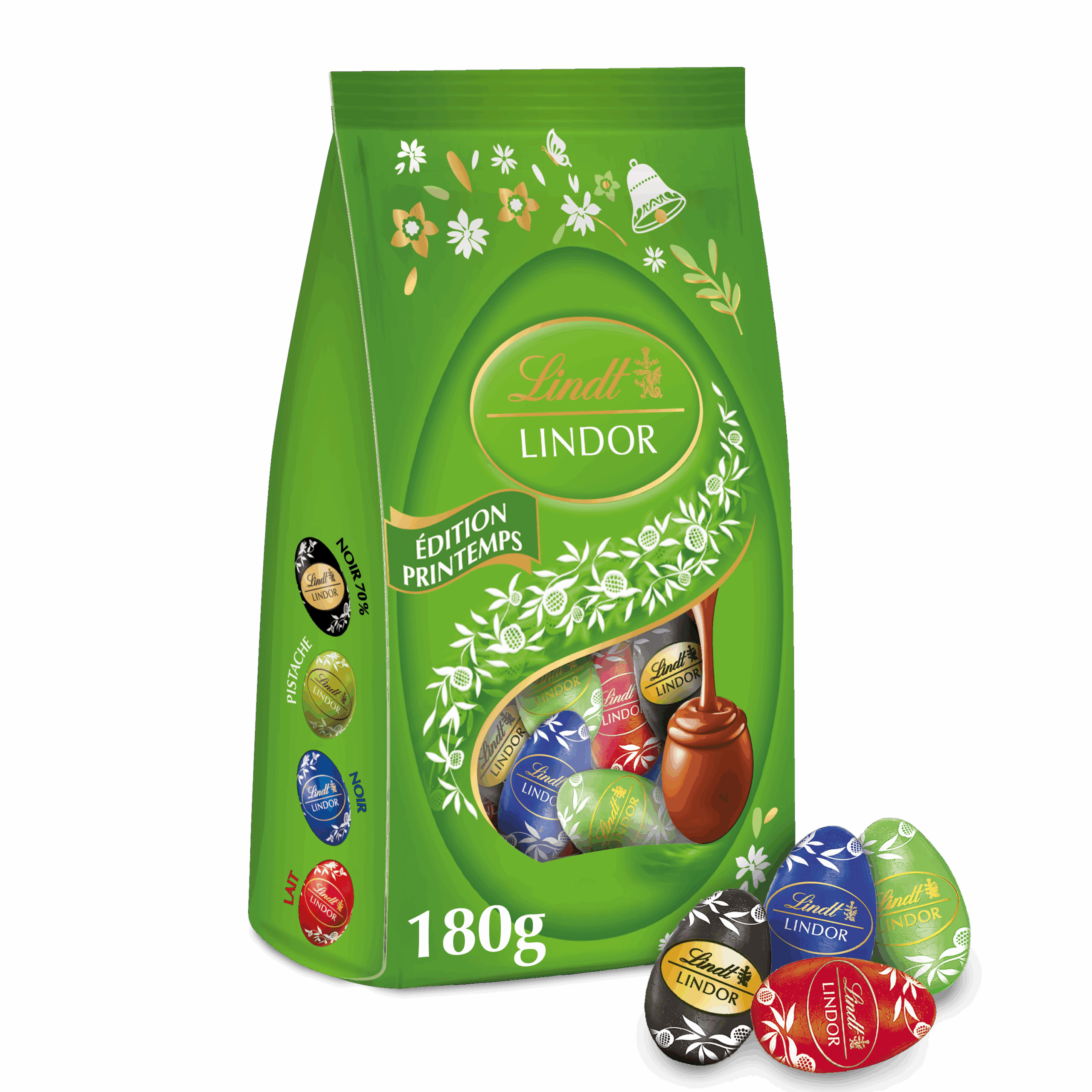 Sachet de 180 g d’œufs Lindt LINDOR, au chocolat fondant, offrant plusieurs saveurs et assortiments pour un plaisir raffiné à partager ou à offrir.