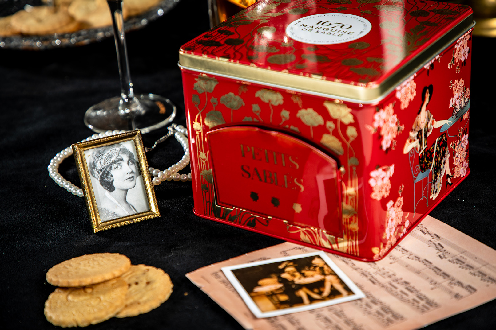 Biscuits sablés nature pur beurre frais et pépites de caramel – Boîte métal distributrice « Les Folies » 300g