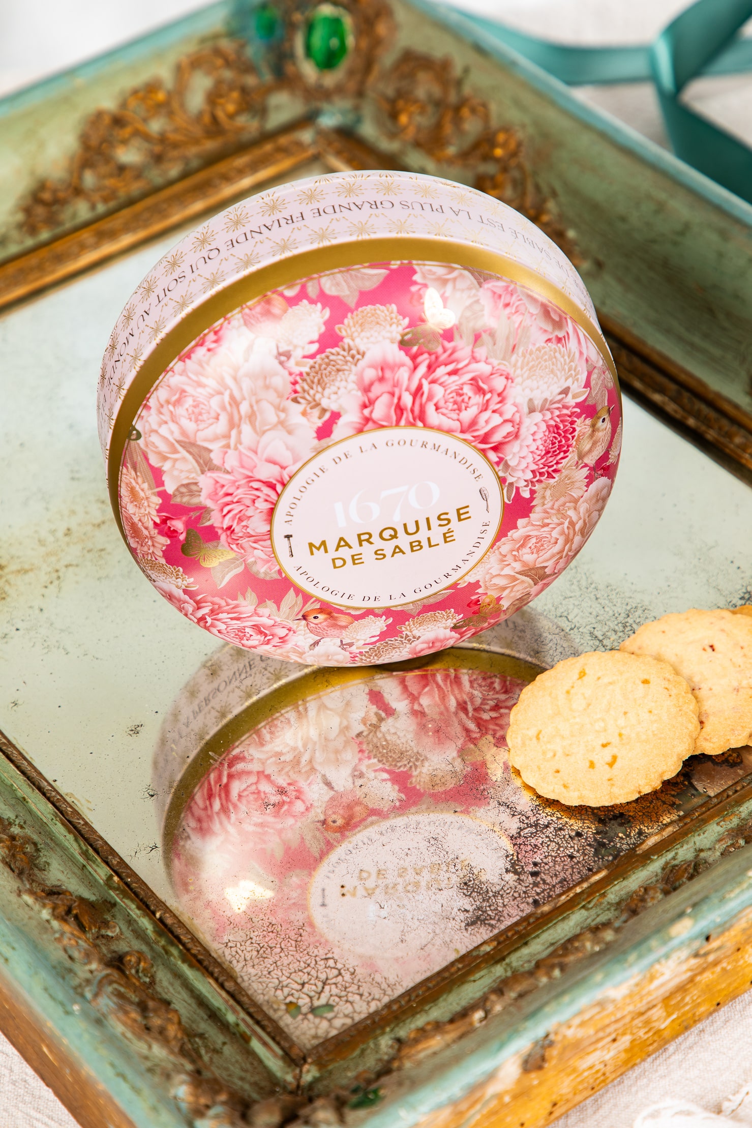 Boîte métal ronde au design raffiné, renfermant 7 sachets fraîcheur de biscuits gourmands aux délicates pépites d’abricot