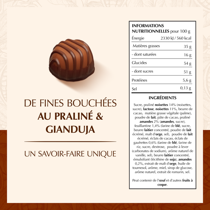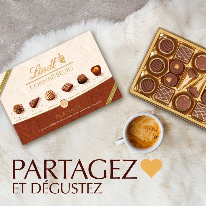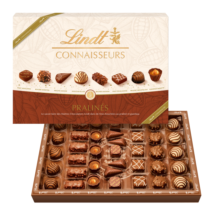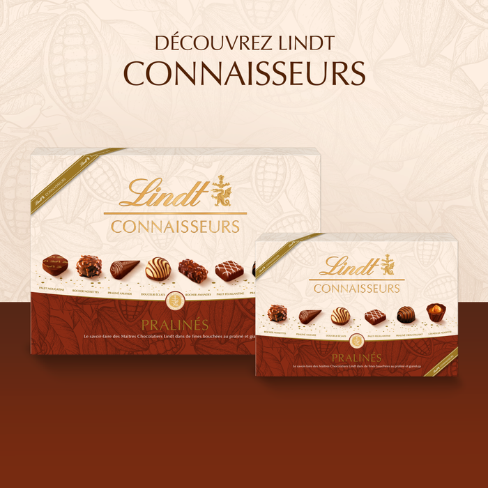 Le coffret Connaisseurs Pralinés réunit un assortiment raffiné de bouchées fourrées aux meilleurs pralinés et gianduja, imaginé par les Maîtres Chocolatiers Lindt. Chaque pièce révèle une texture fondante, un équilibre soigné d’arômes et un véritable hommage au savoir-faire chocolatier. Disponible en deux formats, 180g pour un plaisir plus intimiste ou 409g pour un partage généreux. Un cadeau gourmand ou un moment de dégustation à savourer avec élégance.
