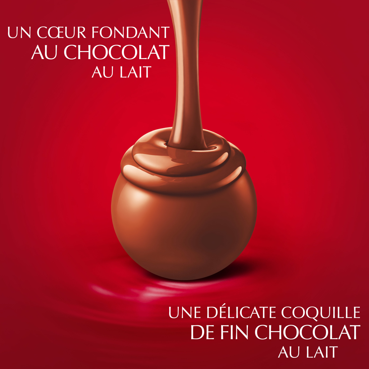 Sous sa fine coquille de chocolat au lait se cache un cœur fondant qui fond littéralement en bouche, pour un moment de pur bonheur.