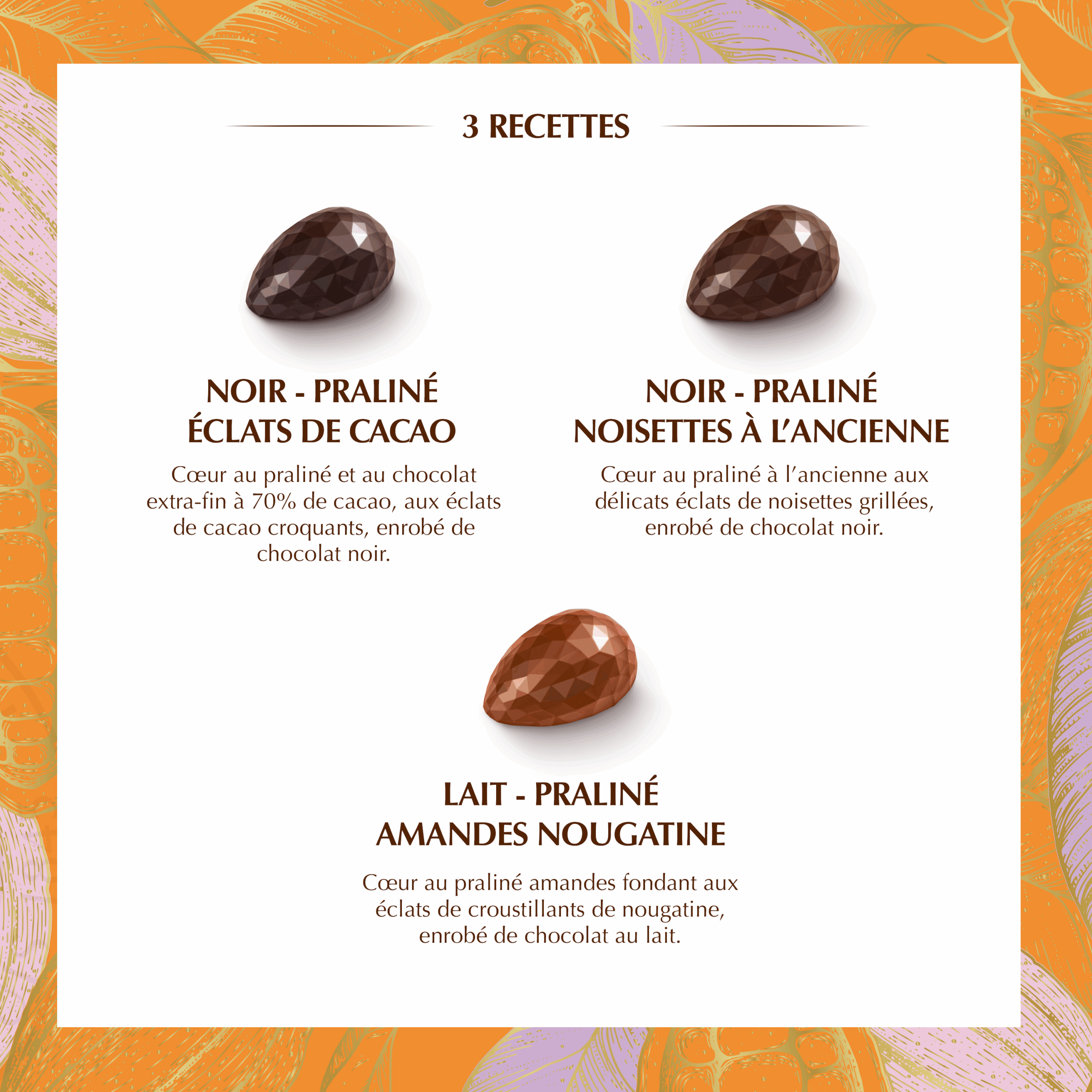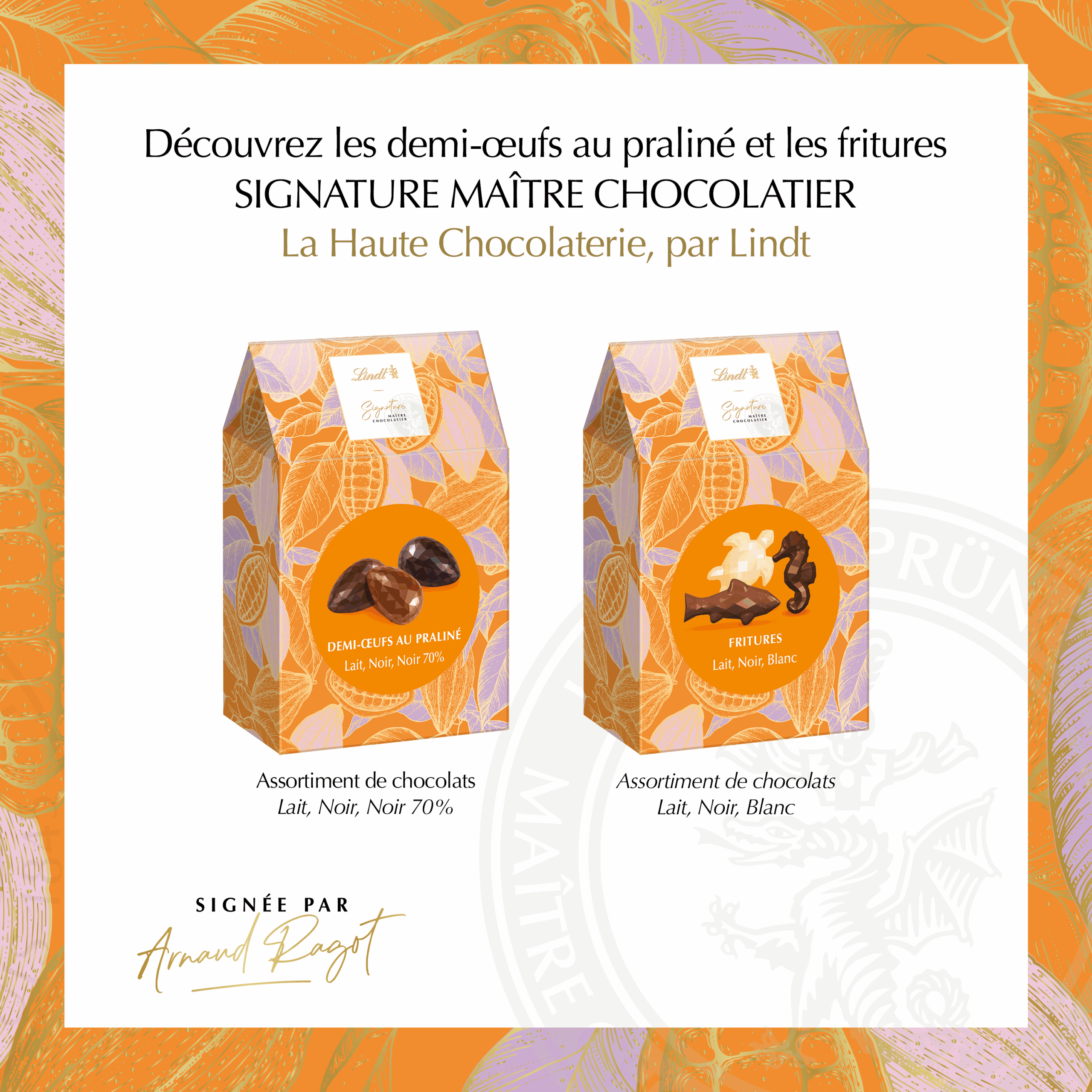 La collection Demi-Œufs Lindt Friture 120 g, issue de la gamme SIGNATURE Maître Chocolatier, propose des créations uniques au chocolat fin. Chaque demi-œuf présente une coque délicatement sculptée renfermant un généreux cœur au praliné, décliné en chocolat au lait, noir ou noir 70 %. Ces gourmandises raffinées allient élégance, texture fondante et richesse de goût, séduisant autant les amateurs de chocolat classique que les palais en quête de sensations plus audacieuses. Une expérience de dégustation parfaite pour Pâques ou pour toute occasion chocolatée.